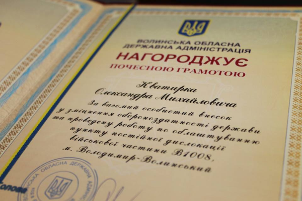 Зокрема, за вагомий особистий внесок у зміцнення обороноздатності держави та проведену роботу по облаштуванню пункту постійної дислокації військової частини В1008, м. Володимир-Волинський нагороджено почесною грамотою обласної державної адміністрації: