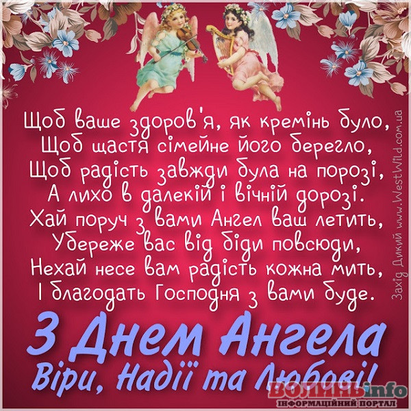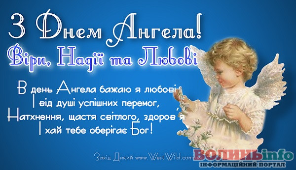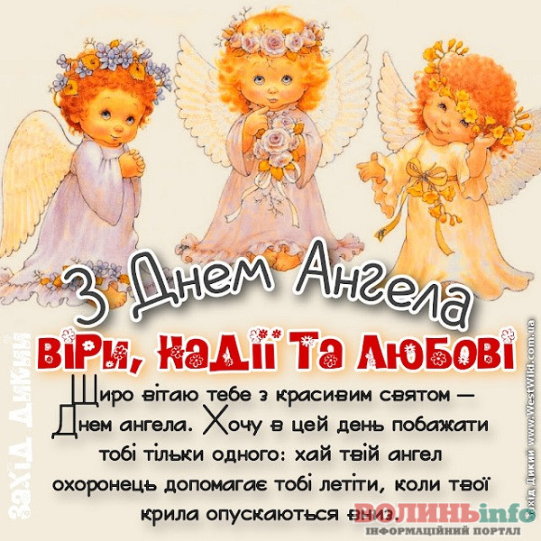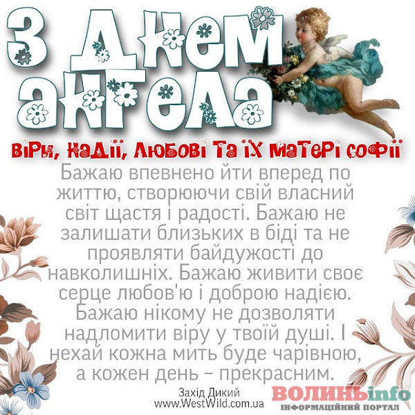 Вітаю з Днем Ангела усіх неймовірних жінок з іменами Віра, Надія, Любов та Софія! Нехай ваші небесні охоронці будуть поруч у хвилини радості і смутку, кохання і розлучень, щохвилини, щосекунди. Нехай життя дарує багато причин для щастя!