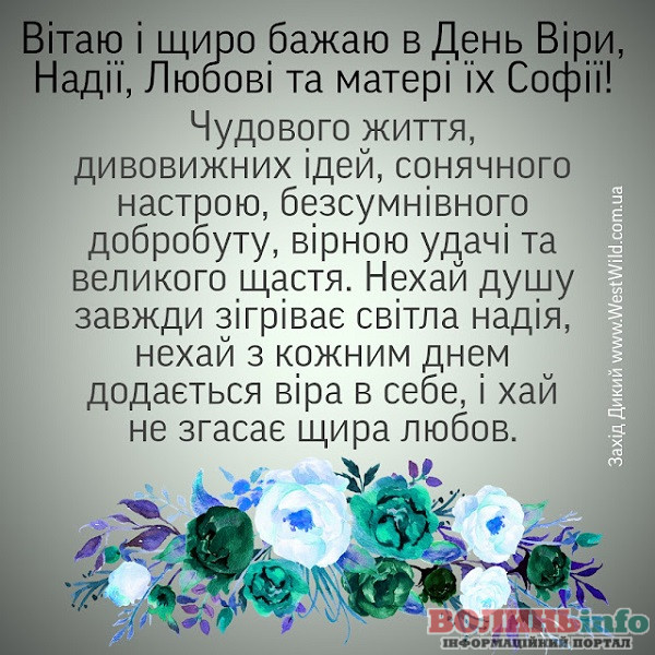 У святе свято – день Віри, Надії, Любові та матері їх Софії бажаю, щоб у всьому щастило. Нехай небеса оберігають ваш дах і сім’ю від негараздів, віра міцніє, надія буде великий і не марною, а в душі не згасає ласкаве світло любові. Від щирого серця бажаю жити щасливо, берегти в серці любов і завжди таїти світлу надію, вірити тільки в хороше і перемагати будь-яку невдачу. Нехай твоя віра робить тебе сильнішим, нехай твоя любов буде чиста і щира, нехай добра надія висвітлює твій шлях, нехай буде в житті радість, гармонія. та щастя.