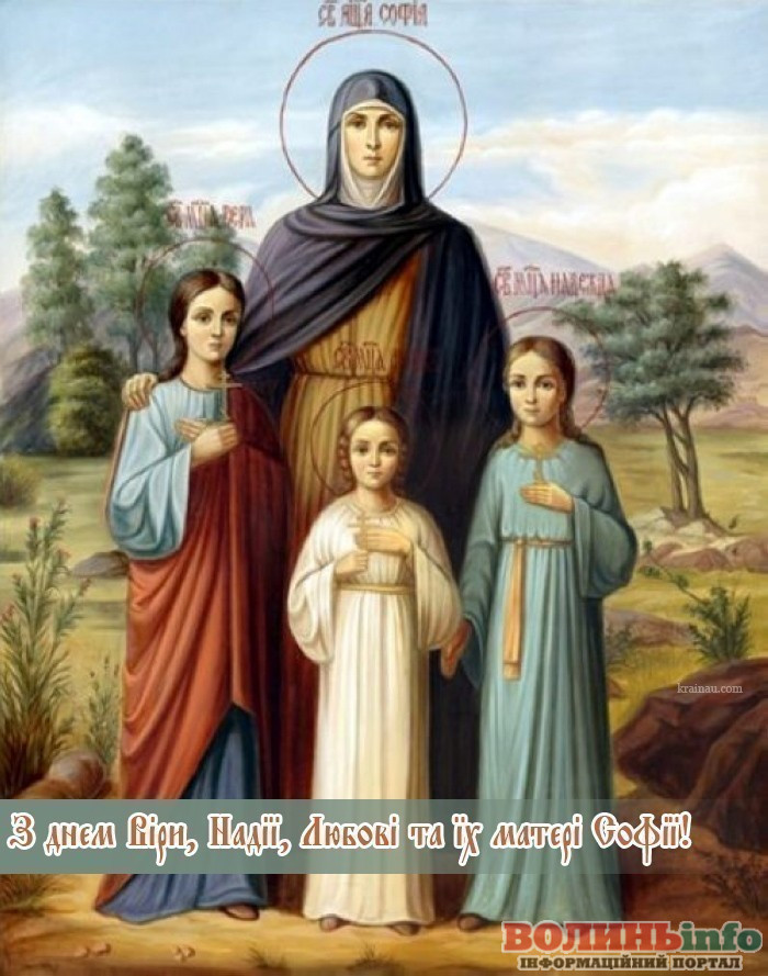 17 вересня православна церква вшановує святу Софію та її трьох дочок — Віру, Надію та Любов. Ці жінки належали до перших християн, і в дуже юному віці постраждали за свою віру: маленьких Віру (12 років), Надію (10 років) та Любов (9 років) зрадили страшним болісним тортурам на очах у матері.