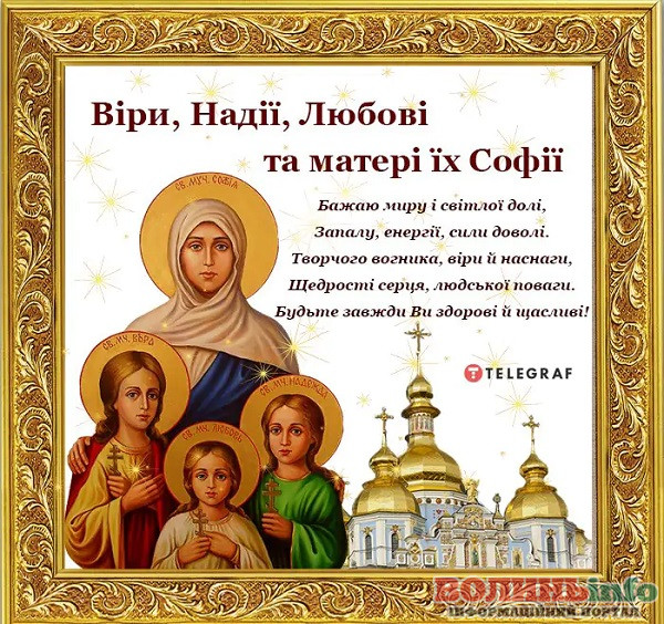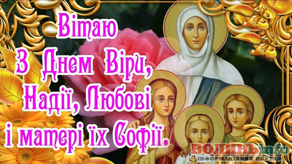 Вітаю з Днем Віри, Надії, Любові та матері їх Софії! Нехай День пам’яті святих мучениць допоможе: зміцнити силу духу і мужність; з гідністю і смиренністю переносити всі негаразди; затвердити непохитну віру; берегти щастя; жити в любові та злагоді.