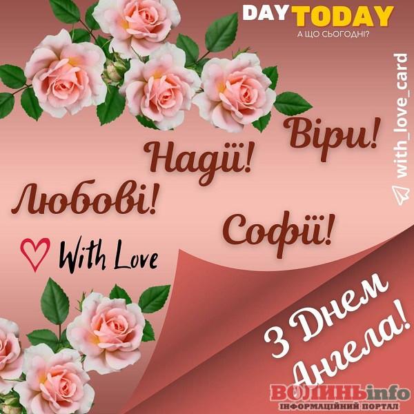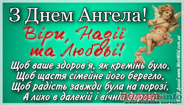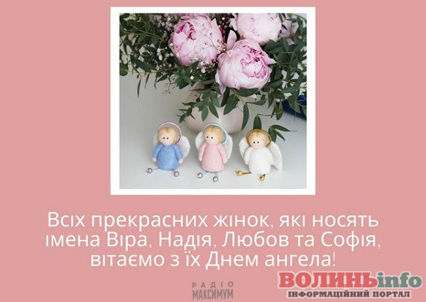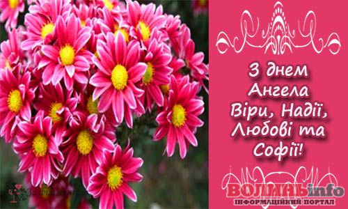 Усіх прекрасних жінок на ім’я Віра, Надія, Любов та Софія, вітаємо з їхнім Днем ангела. Нехай у вашому житті будуть радість, щастя, мир і, звичайно, все те, про що говорять ваші прекрасні імена. Нехай життєві випробовування будуть по плечу, а всередині знаходяться сили перебороти усе. Бажаю всього найсвітлішого!