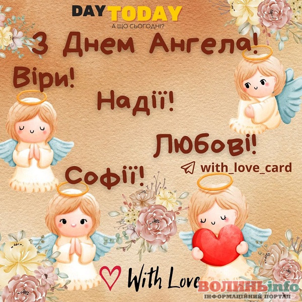 Всіх, хто носить чудові імена Віра, Надія, Любов та Софія поспішаємо привітати з Днем Ангела, бажаємо міцного здоров’я, спокійного серця, миру в душі та домі, теплої дружньої компанії та красивого сонячного дня. Будьте щасливі!