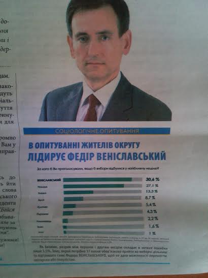 Також зазначимо, що в одному із випусків агітаційної газети Федора Веніславського «Волинь. Жити по-людськи» розміщені результати соціологічного опитування щодо ймовірних переможців у проміжних виборах до Верховної Ради України.