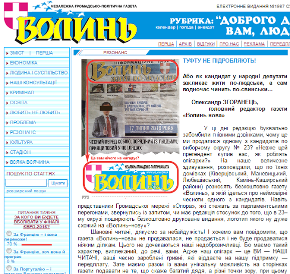 «Щодо хитруватого кандидата, який вирішив набрати кілька балів за рахунок випуску газети, логотип якої справді дуже нагадує наш… Не будемо називати його прізвище, щоб не робити зайвої реклами. Хоч і реклама тут допоможе, як мертвому кадило… На перший погляд його передвиборні гасла звучать непогано: «Чесний перед собою, порядний із людьми, принциповий у поглядах»… Очевидно тільки, що такі слова кандидата в народні депутати треба писати у лапках. Бо коли глянеш на логотип його «газети», одразу згадується народна приказка: «На злодієві шапка горить» («шапка» — так журналісти називають один із типів заголовка, що об’єднує декілька газетних публікацій; іноді так кажуть і на сам заголовок (логотип) газети). Ми ні в якому разі не хочемо привласнювати слово «Волинь», але шрифт, яким воно написане, — особливий, авторський, зроблений на замовлення нашої газети ще в кінці минулого століття… А ось представників контролюючих органів ми просимо поцікавитись, чи має право «інформаційна газета» друкуватись без дати реєстрації і номера випуску, не кажучи вже про безсоромну крадіжку чужого логотипа?», – йдеться в публікації «Туфту не підробляють» головного редактора «Волині-нової» Олександра Згоранця, яка опублікована на сайті цієї газети.