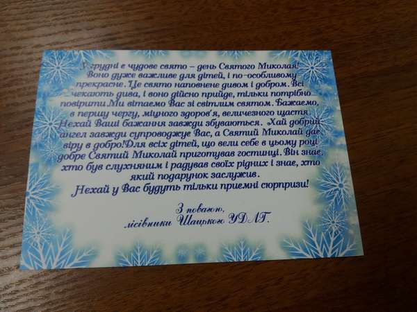 Щасливі ті, хто у таке свято має кому залишити подарунок під подушкою. І не менше тішаться – як діти, так і дорослі – якщо Святий Миколай не забув про їхні побажання. Волинські лісівники вже традиційно опікуються дітками соціальних категорій. Керівництво та профспілки всіх без винятку державних лісогосподарських підприємств Волині завжди знаходять можливість відвідати своїх підопічних та потішити нехай маленькими, але подарунками. Це додає наснаги на цілий рік, зізнаються лісівники.