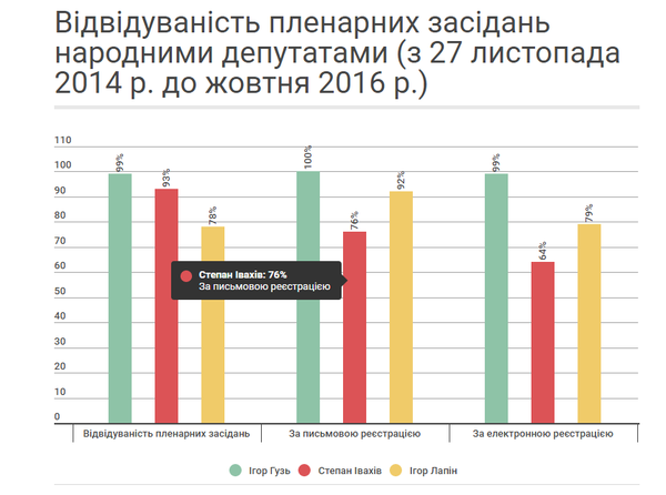 Відповідно до результатів аналізу отриманих звітних форм, найкраще відвідує пленарні засідання Верховної Ради України представник 19-го виборчого округу Ігор Гузь, у якого цей показник становить 99% (100% – за письмовою реєстрацією та 99% – за електронною реєстрацією). У народного депутата Степана Івахіва, який представляє 21-й виборчий округ, показник відвідуваності парламентських сесій – 93% (у тому числі, за письмовою реєстрацією – 76%, за електронною реєстрацією – 64%). Представник 22-го виборчого округу, народний депутат Ігор Лапін відвідав 78% пленарних засідань (з них: за письмовою реєстрацією був присутній у 92% випадків, за електронною реєстрацією – у 79%). Зазначимо, що при визначенні загального показника відвідуваності пленарних засідань ВРУ враховувався також показник фактичної участі нардепів у голосуваннях.