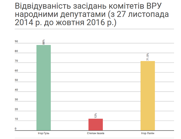 Найвищий показник відвідуваності засідань свого комітету у результаті аналізу виявився у Ігоря Гузя. 88% засідань відвідав нардеп. Дещо нижчий відсоток відвідуваності засідань комітету у Ігоря Лапіна – 71,5%. На противагу своїм колегам-депутатам, Степан Івахів не часто відвідує свій комітет. Показник присутності нардепа на засіданнях комітету становить лише 12%.