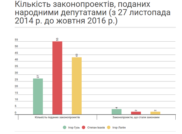 З-поміж трьох народних депутатів найбільше законопроектів подав Степан Івахів – 55, втім, лише 2 з них стали законами.Ігор Лапін напрацював 43 законопроекти. Аналогічно, 2 з них стали законами. Натомість, найменше законопроектів зареєстрував у парламенті Ігор Гузь – 27. 4 з них були позитивно проголосовані.