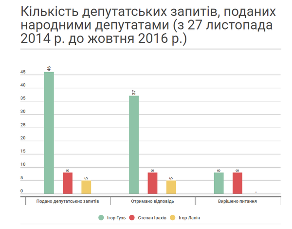 Абсолютну більшість депутатських запитів подав представник 19-го округу в Раді. На рахунку Ігоря Гузя таких запитів 46. 8 депутатських запитів підготував Степан Івахів. І лише 5 запитів – представник 22-го виборчого округу Ігор Лапін.