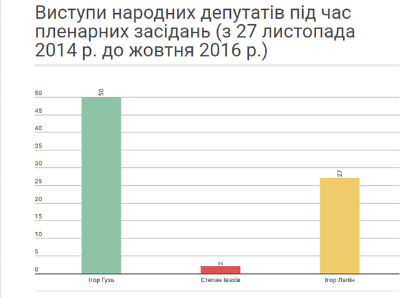 79 разів за період з 27 листопада 2014 р. до жовтня 2016 р. виступали волинські представники на засіданнях парламенту. Зокрема, Ігор Гузь має на своєму рахунку 50 виступів під час сесій. Ігор Лапін виступав у парламенті 27 разів. І лише двічі виступав у Раді Степан Івахів.