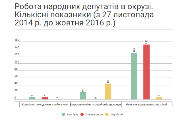 Якщо проаналізувати кількісні показники роботи в окрузі кожного окремого народного депутата, то отримаємо наступні результати.