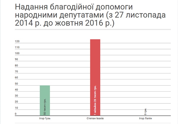 Відзвітували народні депутати і про свою благодійну діяльність. Зокрема, Ігор Гузь у 2015 р. роздав подарунків дітям до Дня Святого Миколая на загальну суму 50 тисяч гривень. Ігор Лапін благодійної діяльності не здійснював. Натомість, найбільшим благодійником можна вважати Степана Івахіва, який за період депутатської роботи виділив допомоги з благодійного фонду «Патріоти Волині» у 2014 р. на суму – 498 тисяч грн., у 2015 р. – 478 тисяч грн., у 2016 р. – 50 тисяч грн.