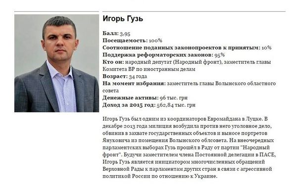 Волинський депутат Ігор Гузь не пропустив жодного засідання Верховної Ради та підтримав 95% важливих рішень, і має 10% співвідношення поданих законопроектів до прийнятих. Він на 8 сходинці серед 423 обранців.