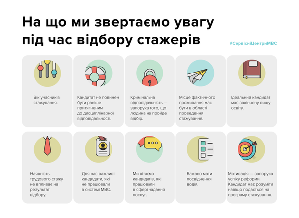 Відповідно до статистики по Україні понад 90% кандидатів на місця стажерів у сервісних центрах МВС не працювали раніше у системі МВС, близько 50% кандидатів працевлаштовані на момент подачі анкет і більше 60% мають досвід роботи у сфері послуг.