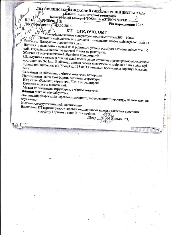 Жінці встановили діагноз — злоякісний новоутвір головки підшлункової залози. Крім того, в печінці виявили кісту.