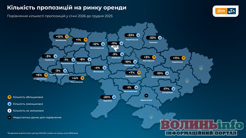 Сегмент оренди на Волині у січні показав позитивну динаміку для тих, хто шукає житло. Кількість пропозицій в області зросла на 12%. Це один із найвищих показників в Україні (більше лише у Харківській області — +11%). Ціни на оренду здебільшого зростають, слідуючи за загальнодержавним трендом, де лідером залишається столиця з ціною 22,5 тис. грн за однокімнатну квартиру.