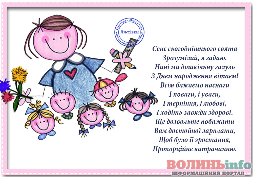 Вітаємо з Днем вихователя і всіх дошкільних працівників! У роботі вам доводиться докладати великих зусиль, щоб допомагати малюкам розвиватися, розкрити свої здібності, щоб вони відчували себе в стінах дитячого садка в безпеці, як вдома. Спасибі вам за нелегку працю! Нехай дітки завжди будуть з радістю бігти в обійми вихователів. Бажаємо міцного здоров’я, подальших успіхів, матеріального достатку, особистого щастя та Божого захисту!