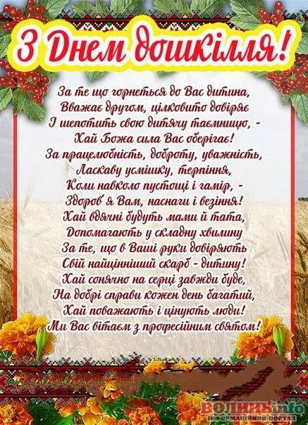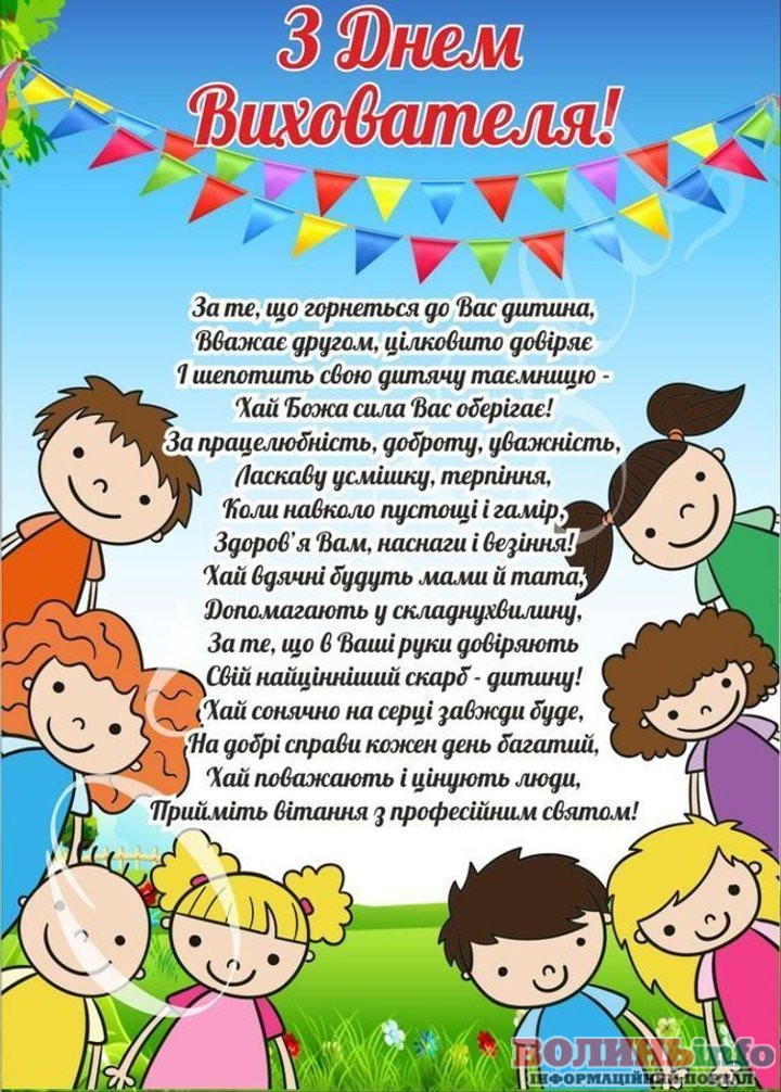 Вітаю з Днем вихователя і всіх дошкільних працівників. Я щиро бажаю і вірити в диво, і разом з дітками творити і створювати його кожен день. Нехай життя сповнене буде прекрасних моментів і ідей, нехай кожна хвилина дарує щастя і задоволення для душі. Міцних сил Вам, здоров’я і благополуччя.
