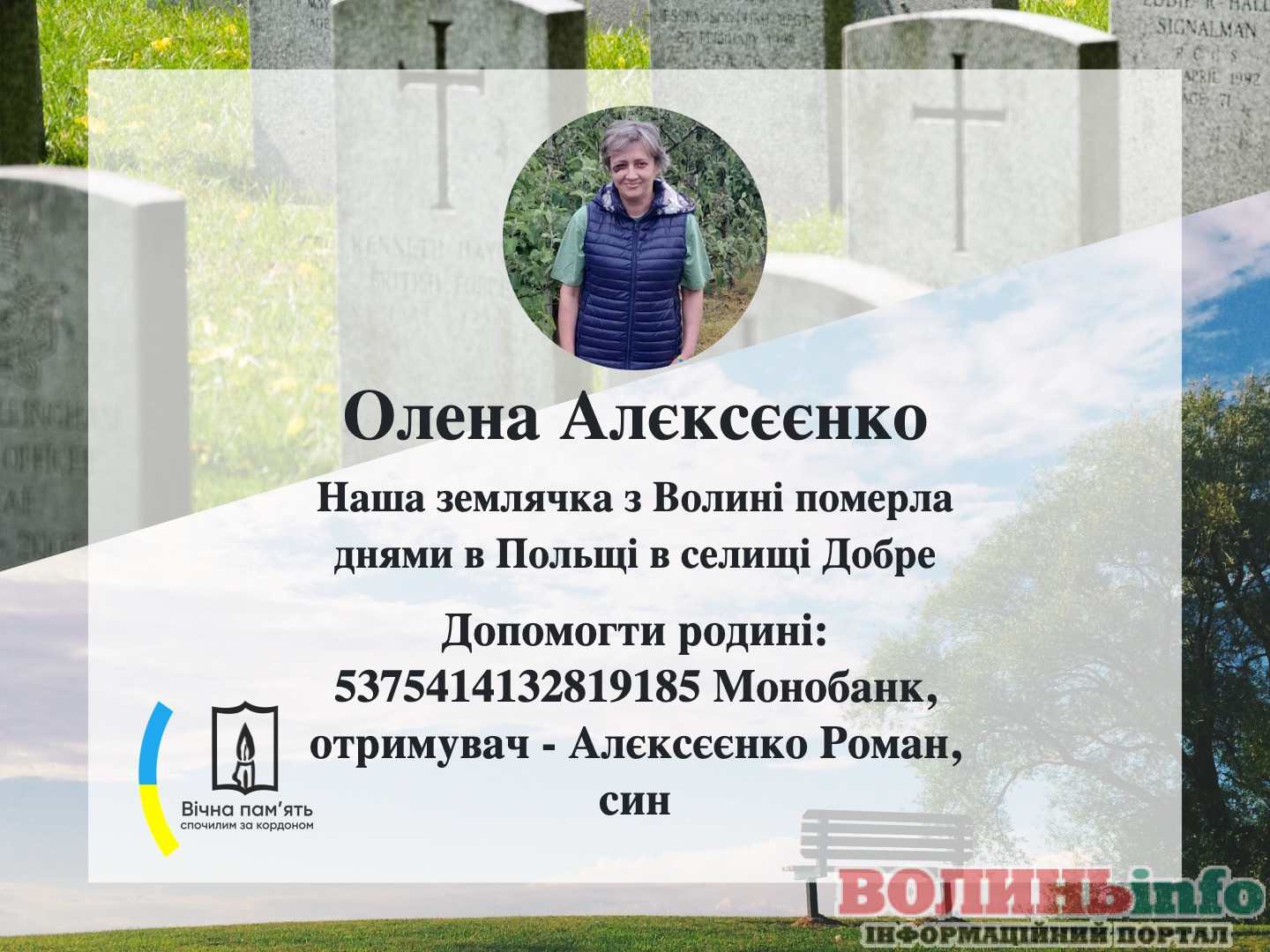 Реквізити для допомоги: 5375 4141 3281 9185, Монобанк, отримувач – Алєксєєнко Роман (син спочилої землячки)», – зазначають у спільноті.