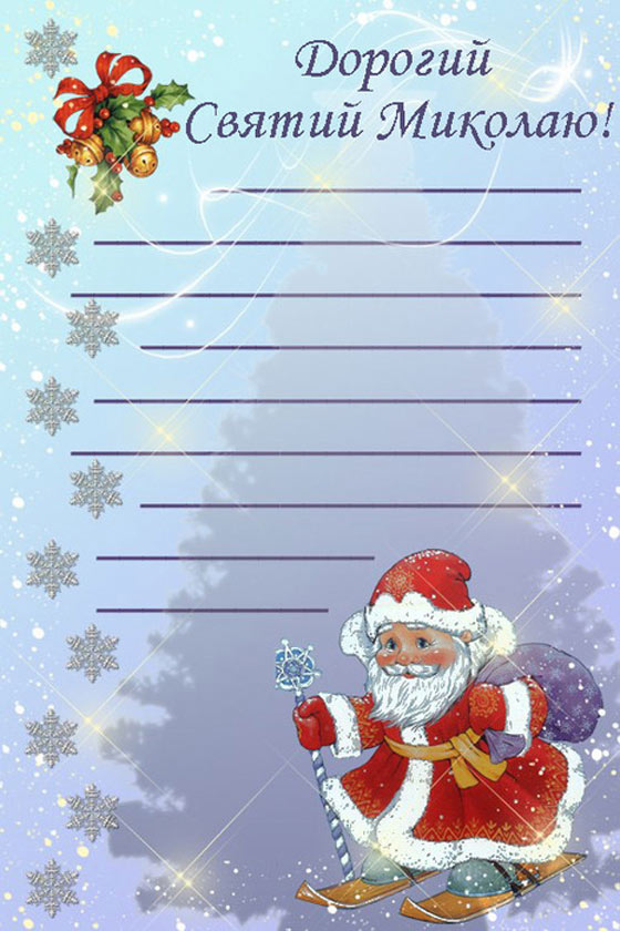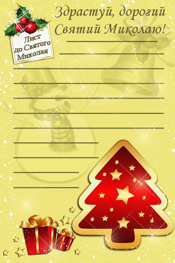 «Здрастуй, Святий Миколай! Протягом всього року я був слухняним, допомагав батькам по дому, складав свої іграшки, старанно вчився. Я чув про багато чудес, які ти здійснюєш і скільки добра робиш людям. Сподіваюся, не відмовиш в моє прохання виконати моє заповітне бажання. Я дуже хочу отримати на свято ………….