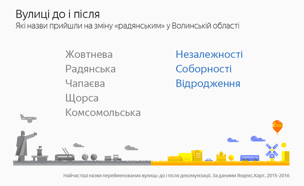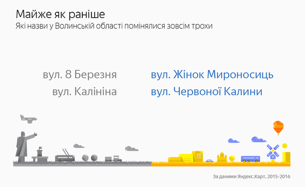 Якщо говорити про теми, яким віддавали перевагу при виборі нових назв вулиць, то на першому місці були події, що відображають новітню історію України. За даними Яндекса, у Волинській області з’явилось дві вулиці Героїв Майдану та по одній вулиці Героїв АТО й Небесної Сотні.
