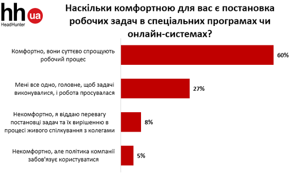 Водночас, для 13% опитаних постановка задач із використанням сучасних технологій є некомфортною. 8% із них, маючи таку можливість, віддають перевагу живому спілкуванню з колегами, а 5% відчувають дискомфорт, але змушені використовувати онлайн-системи чи програми, бо такою є політика компанії.