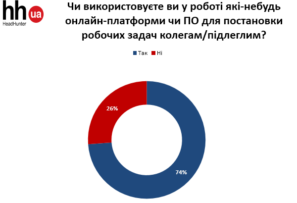 За даними опитування Міжнародного кадрового порталу hh.ua, 74% респондентів у своїй роботі використовують онлайн-платформи чи програмне забезпечення для постановки робочих задач.