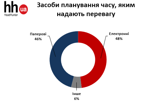 Якщо ж говорити про те, чи використовують українці сучасні технології для організації власного робочого часу, то позиції респондентів розділилися майже порівну. Так, для планування своїх робочих процесів вони використовують як електронні, так і паперові носії інформації – по 48% та 46% відповідно.