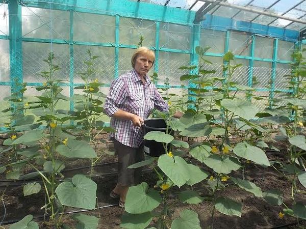 Заходимо до середини. Рівними рядочками ростуть огіркові ліани. Євгенія Петрівна походжає між рядками і обережно обриває горішні вуса.