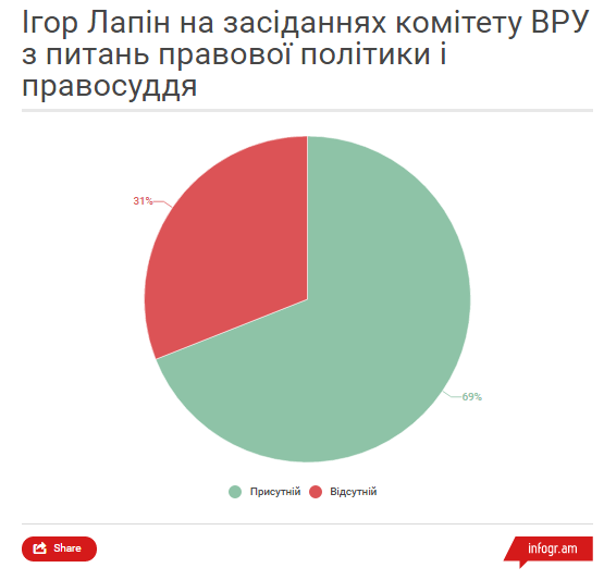69% засідань свого комітету відвідав народний депутат від фракції «Народний Фронт» у парламенті Ігор Лапін. З 27 листопада 2014 року до 10 травня 2016 року відбулось 45 засідань Комітету Верховної Ради України з питань правової політики та правосуддя, у якому працює нардеп. На 14 з них народний депутат, який представляє м. Луцьк у Раді пропустив 14.