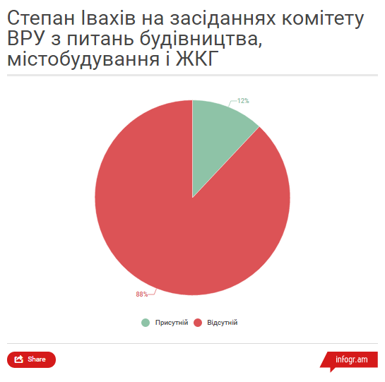 Навпаки, найнижчий показник відвідуваності засідань комітету у народного депутата Степана Івахіва, представника депутатської групи «Воля народу», який становить 12%. Із 33 засідань Комітету Верховної Ради України з питань будівництва, містобудування і житлово-комунального господарства народний депутат відвідав лише 4.