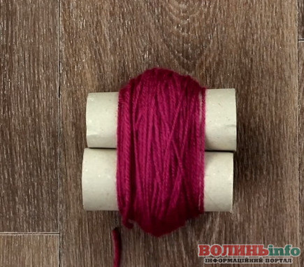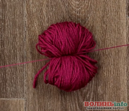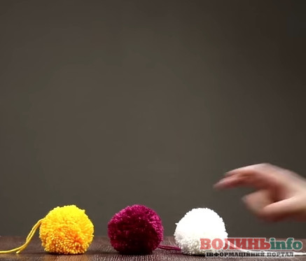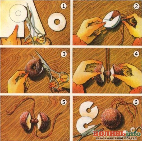 З ниток потрібно зробити помпони. Є кілька способів. У школі нас навчали робити помпони за допомогою двох картонних кілець: обмотуємо їх нитками, зв’язуємо посередині, затягуємо та розрізаємо ножицями.