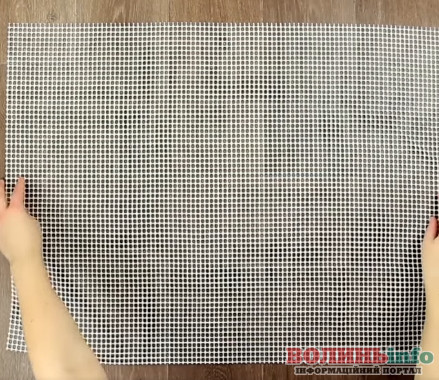 Потім візьміть будівельну сітку і виріжте потрібний розмір для вашого килимка. Це не обов’язково має бути квадрат чи прямокутник. Килимок може мати круглу, овальну, серцеподібну форму або навіть форму тварини.