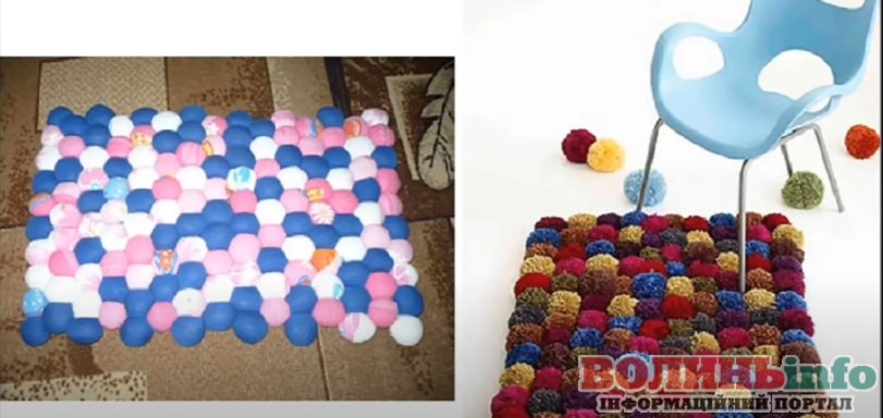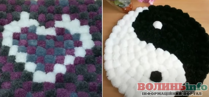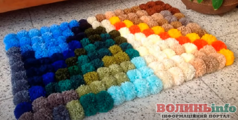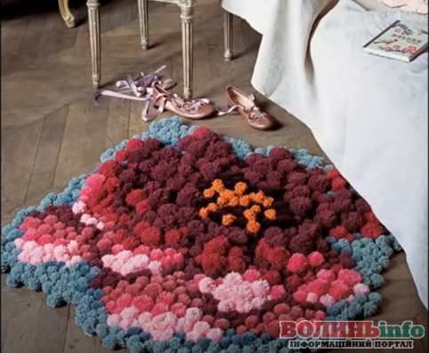 З помпонів можна скласти певний малюнок або розмістити їх по поверхні килима в хаотичному порядку, створюючи веселий і яскравий вигляд.