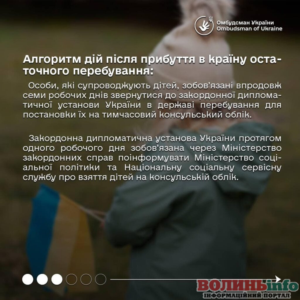 Особи, які супроводжують дітей, зобов’язані протягом семи робочих днів після прибуття до країни перебування звернутися до дипломатичних органів України для постановки на тимчасовий консульський облік. Протягом одного робочого дня закордонна установа України зобов’язана передати ці дані до МЗС. У свою чергу Міністерство закордонних справ України зобов’язане в той же період проінформувати Мінсоцполітики та Національну соціальну сервісну службу про взяття дітей на консульський облік.