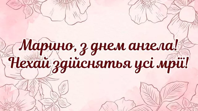 Вітаю тебе з іменинами, мила Мариночко. Нехай буде добрим кожен твій день, нехай із самого ранку приходить щастя, нехай вечорами душа співає і радіє, нехай щоночі сняться приємні сни. Бажаю тобі великого кохання, удачі і везіння!