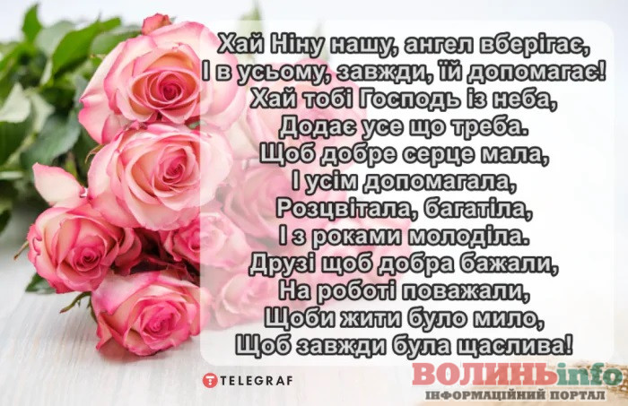 Ніна, вітаю з чудовим святом — Днем ангела! Бажаю світлої дороги до успіху і щастя, яскравих вражень і веселих емоцій, бажаю щирої радості і відмінного здоров’я, вірного кохання і незмінної удачі.