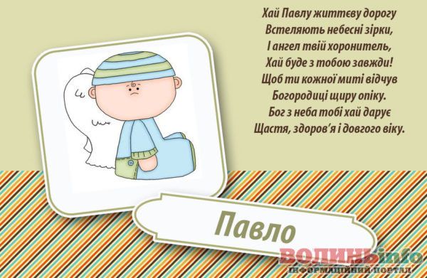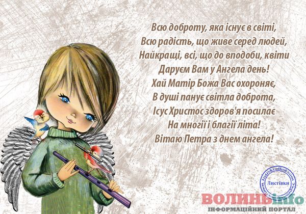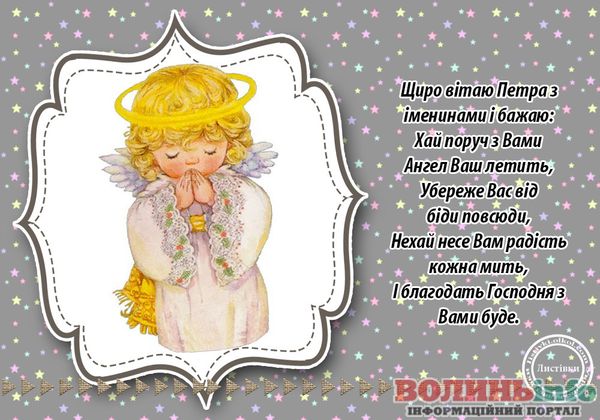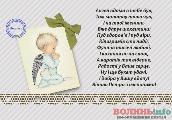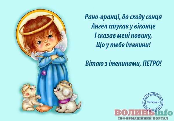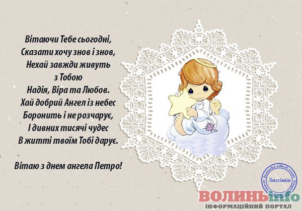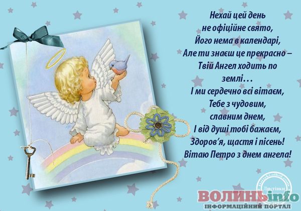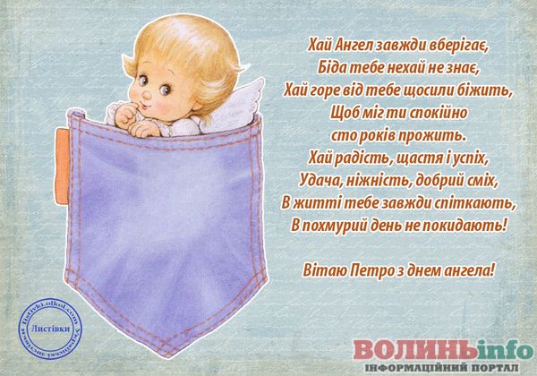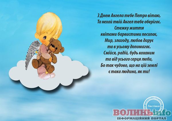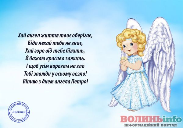 Я помолюсь за Петра всім ангелам в світі. І попрошу волошку у стиглому житі,І попрошу здоров’я і щастя для тебе,Радості світлої, синього неба.Я попрошу для тебе тільки віри і сили,Щоби біди тебе не змели, не скосили.Я попрошу для тебе сили криці і сталі,Щоб турботи щоденні в дорозі відстали.Я помолюсь за тебе всім ангелам в світі,Хай дарують роки тобі довгі і світлі.