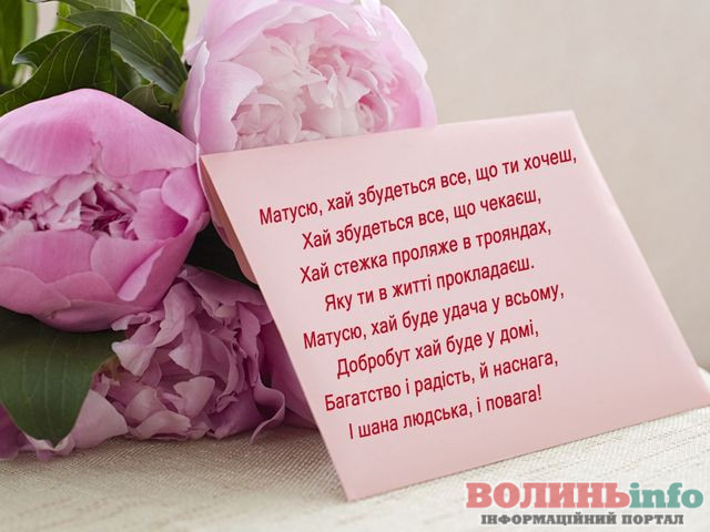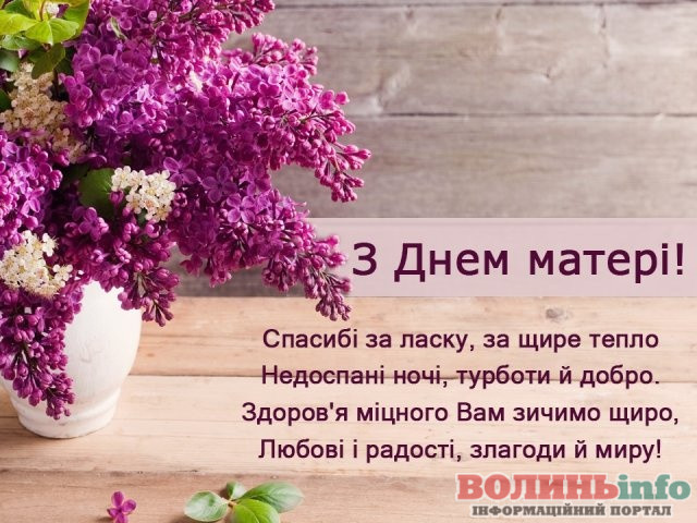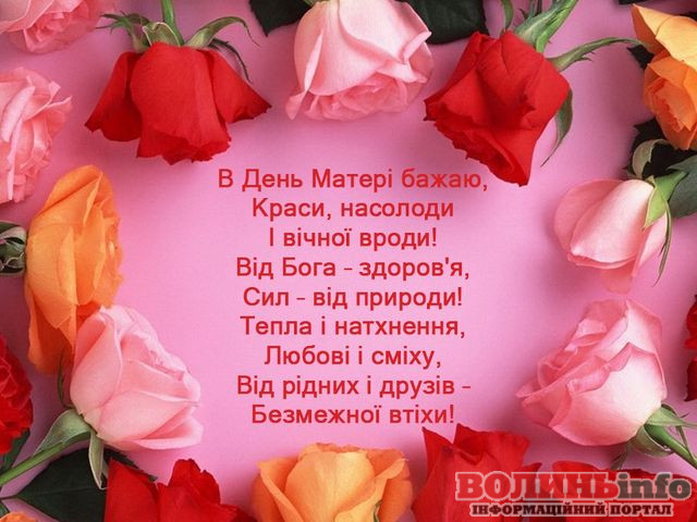 Найперше слово, яке пестить слух до кінця життя. Найніжніші й дбайливі руки. Найдобріше і чуйне серце. У День матері хочу побажати тобі, матусю, справжнього щастя, довгих років життя, відмінного, міцного здоров’я, розуміння і відданості в сім’ї. Нехай по щоках твоїм ніколи не біжать сльози, а в грудях горить гордість за нас, твоїх дітей.