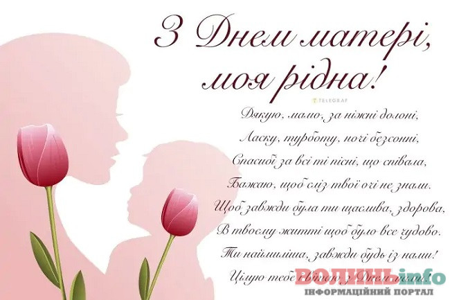 Материнство – маленький подвиг. Нескінченне терпіння, віддача, любов, ніжність, мудрість. Твоїм дітям дорогоцінна кожна твоя зморшка, ти для них найкрасивіша. Тому що ти – Мама. Нехай ниточка, яка існує між матір’ю і дитиною, ніколи не рветься між тобою і твоїми дітьми, нехай вона допомагає, захищає і підтримує вас з обох кінців. З Днем Матері!