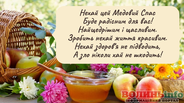 Нехай Медовий Спас принесе тобі безліч позитивних емоцій та сотні яскравих моментів! Бажаю миру, достатку, посмішок та кохання! Нехай у твоїй душі панують гармонія та щастя! Нехай здоров’я буде міцним, а життя — солодким, мов мед!