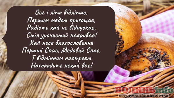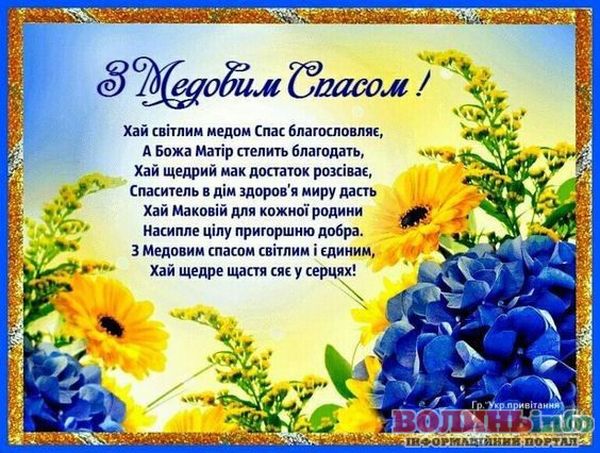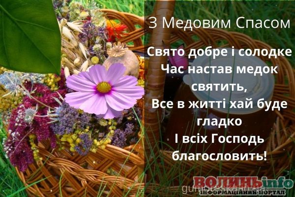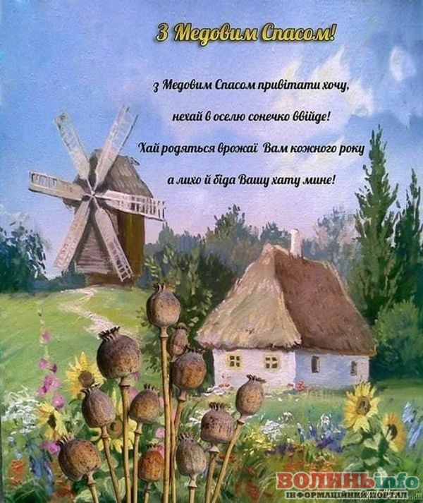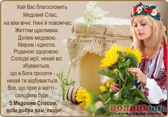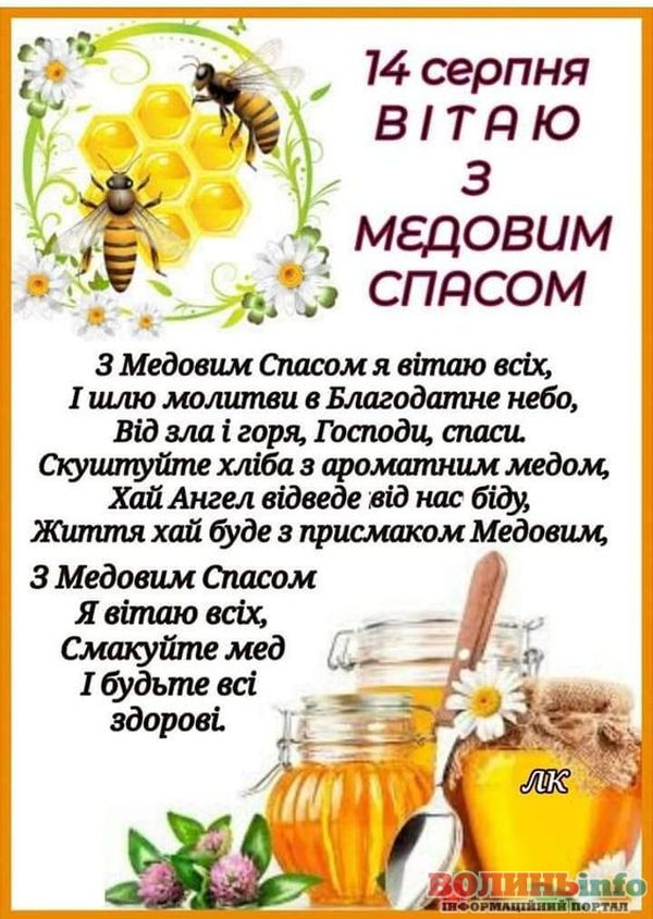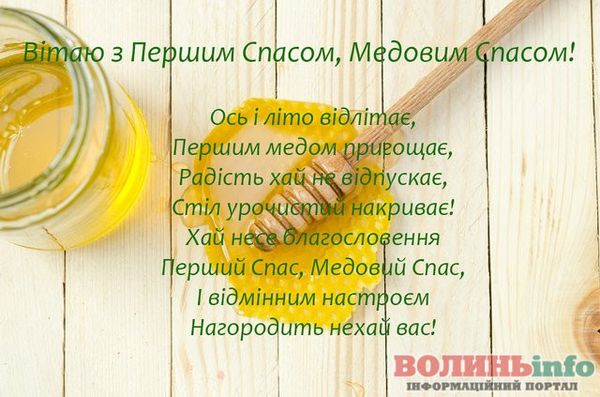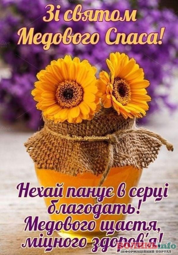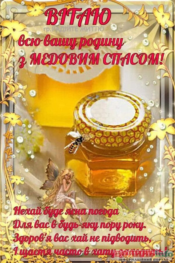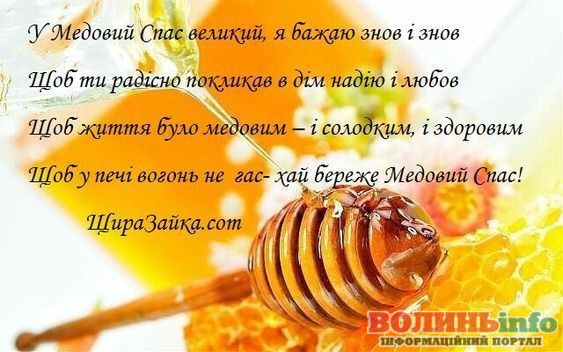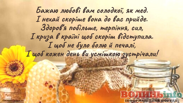 Вітаю Вас із Медовим Спасом! Бажаю, щоб у житті було більше сонця, тепла та літо тривало довго-довго! Нехай Ваші запаси добре зберігаються, а статки заповнюються медовими солодощами! Здоров’я, терпіння, працьовитості, щирості та простоти. Нехай завжди буде благополуччя та розуміння у Вашому домі!