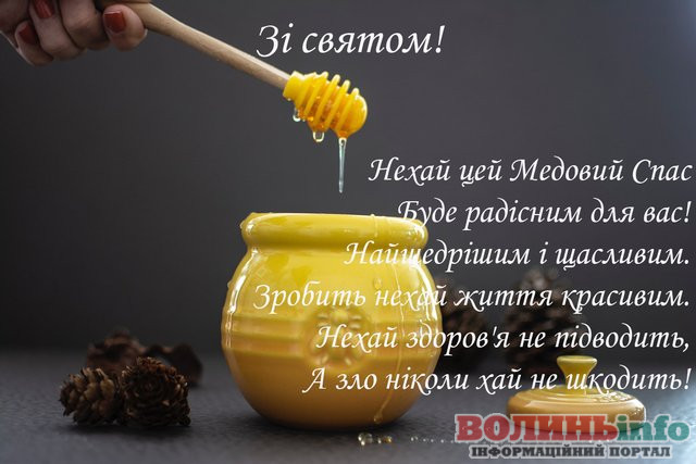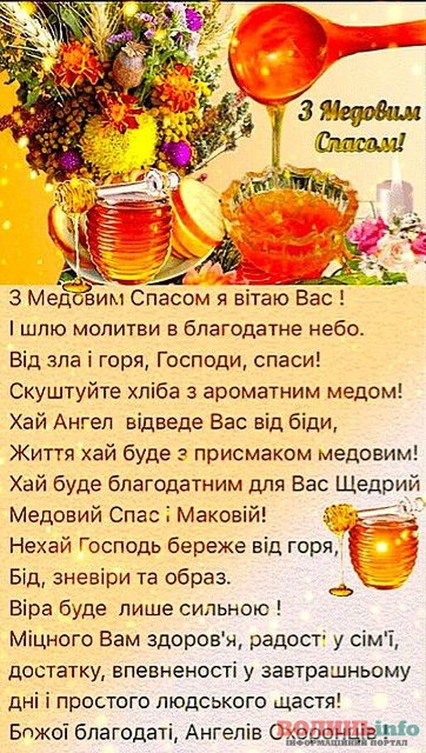 З Медовим Спасом вас я вітаю та бажаю медового, солодкого життя, здоров’я та благополуччя! Медового кохання, завжди ясної погоди, веселощів, терпіння і сил! Щоб щороку приносив плоди та результат від виконаної роботи!