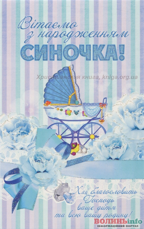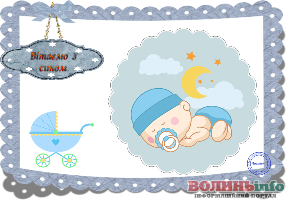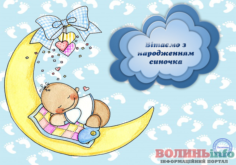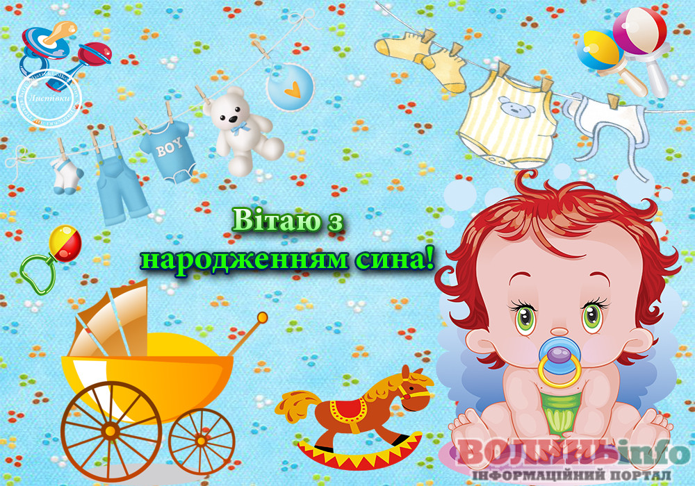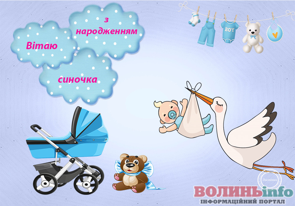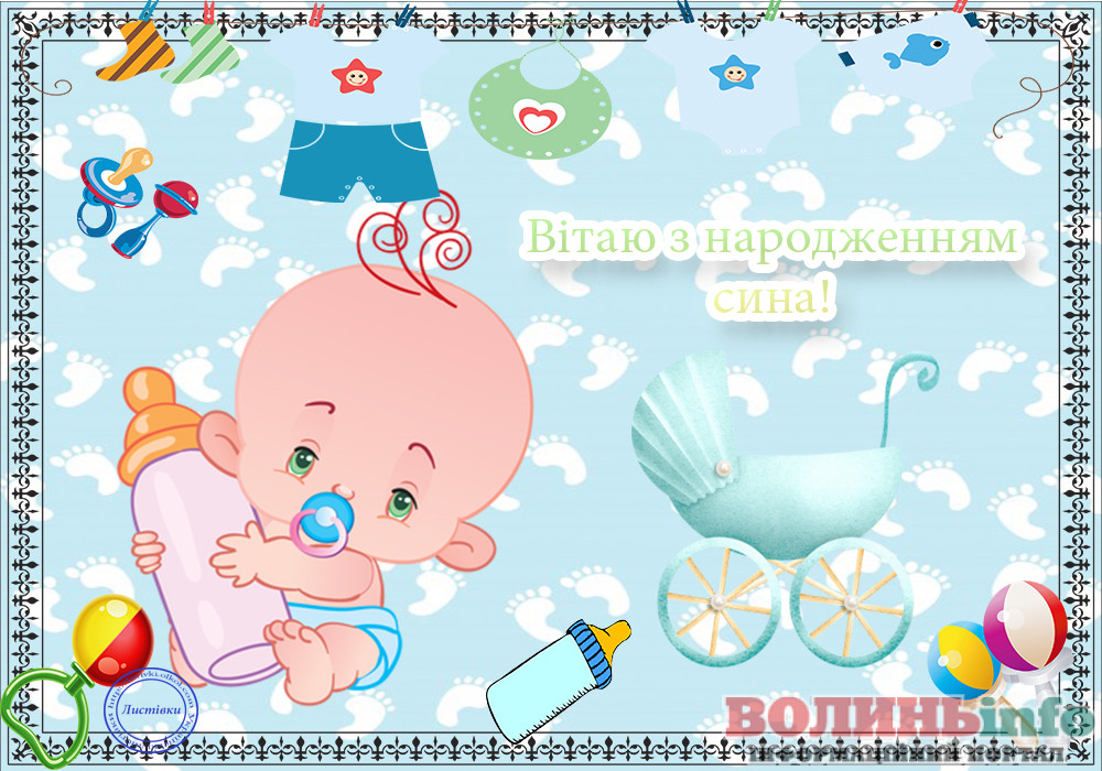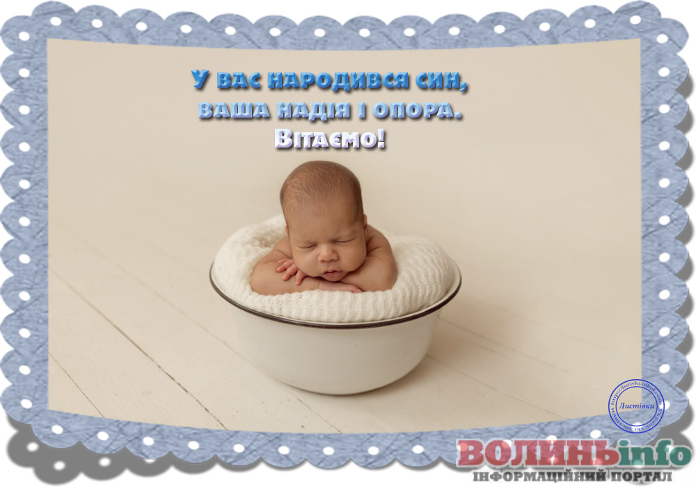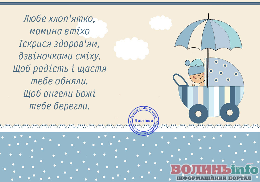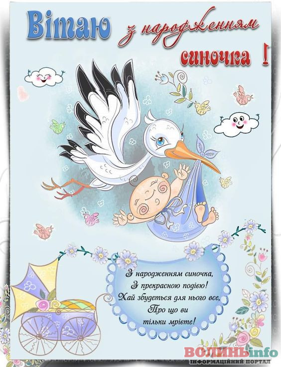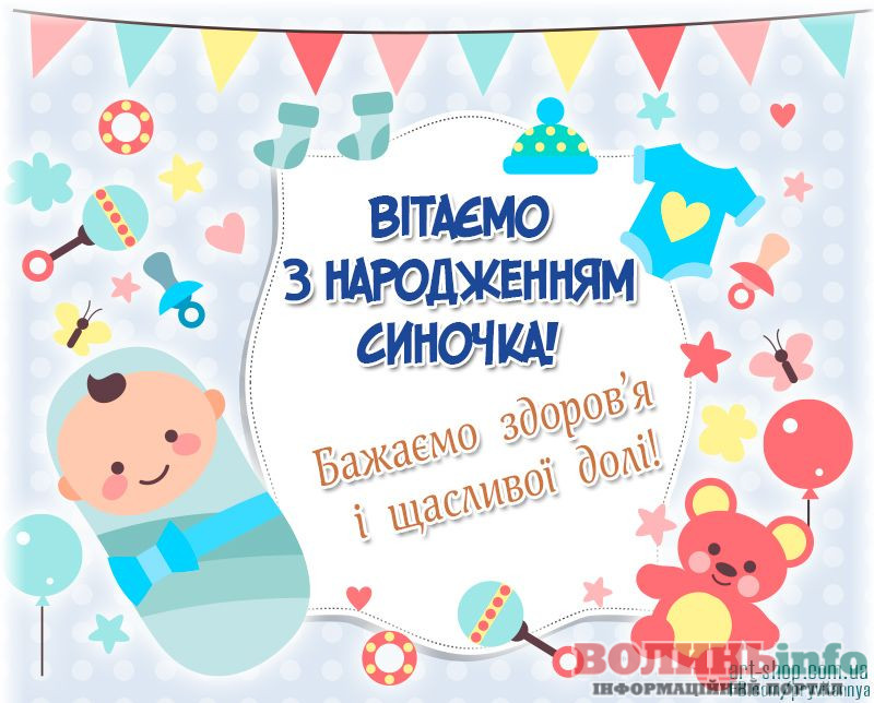 З народженням синочка! Нехай ваш хлопчик має богатирське здоров’я та веселу вдачу! Нехай росте красивим та кмітливим, добрим та чесним. Хай у нього буде багато друзів та цікавих занять. Бережіть своє сонечко, радійте йому, навчайте мудрим речам!