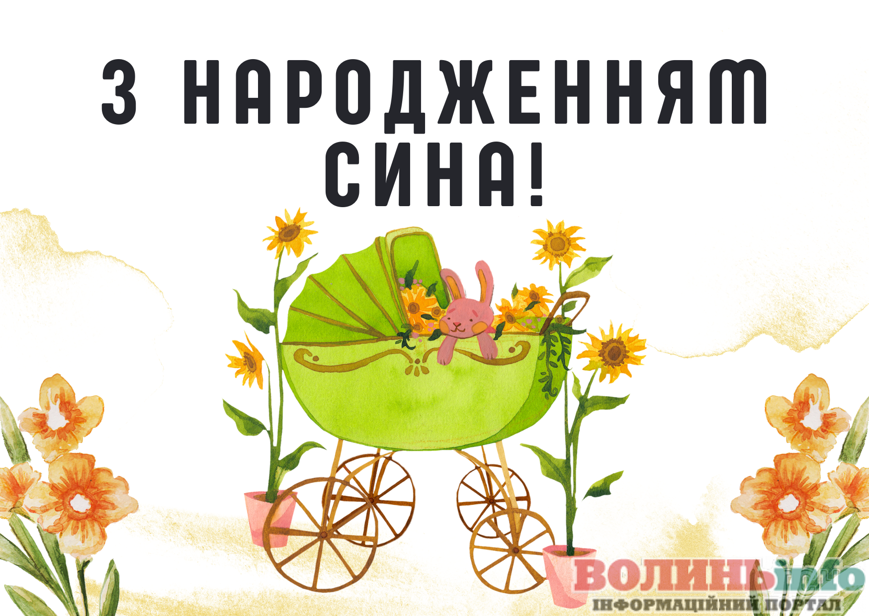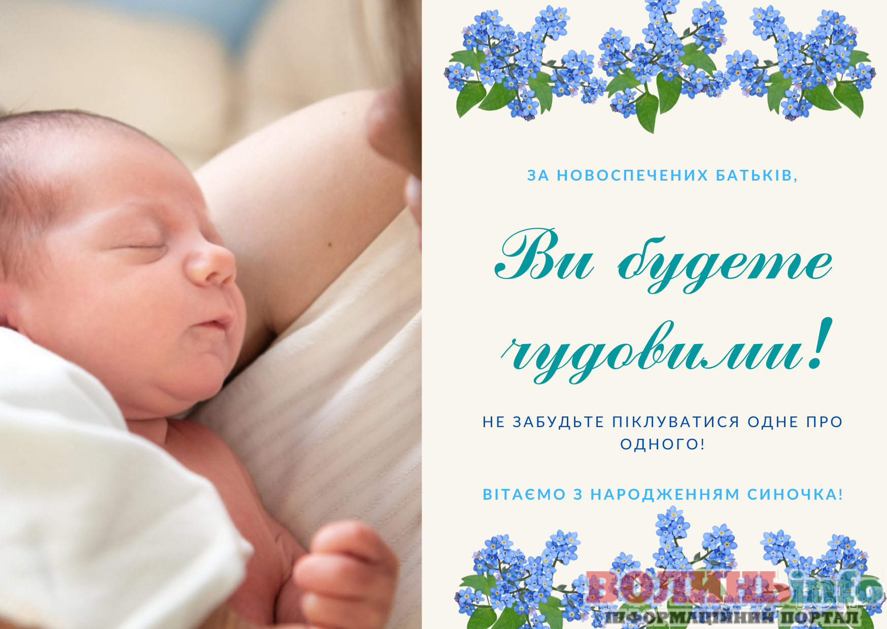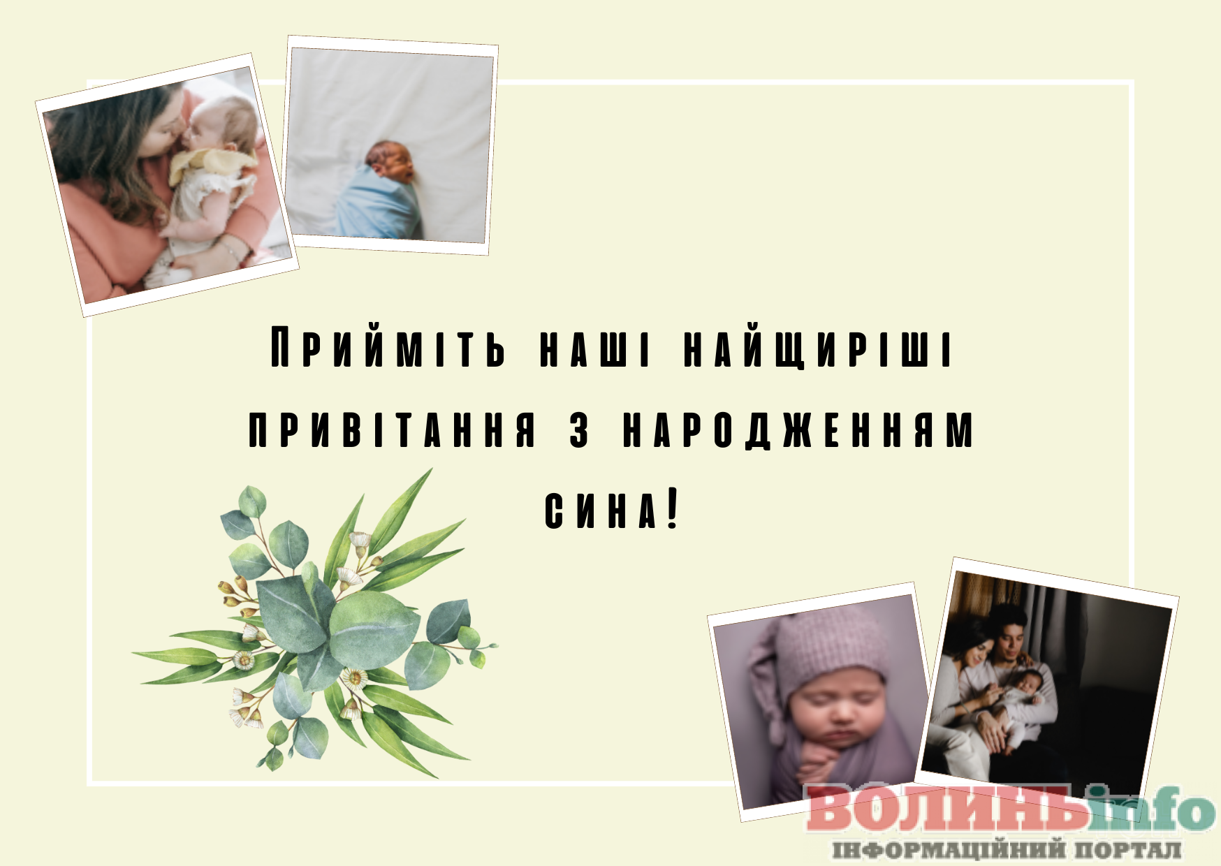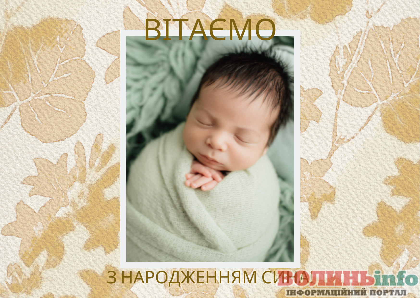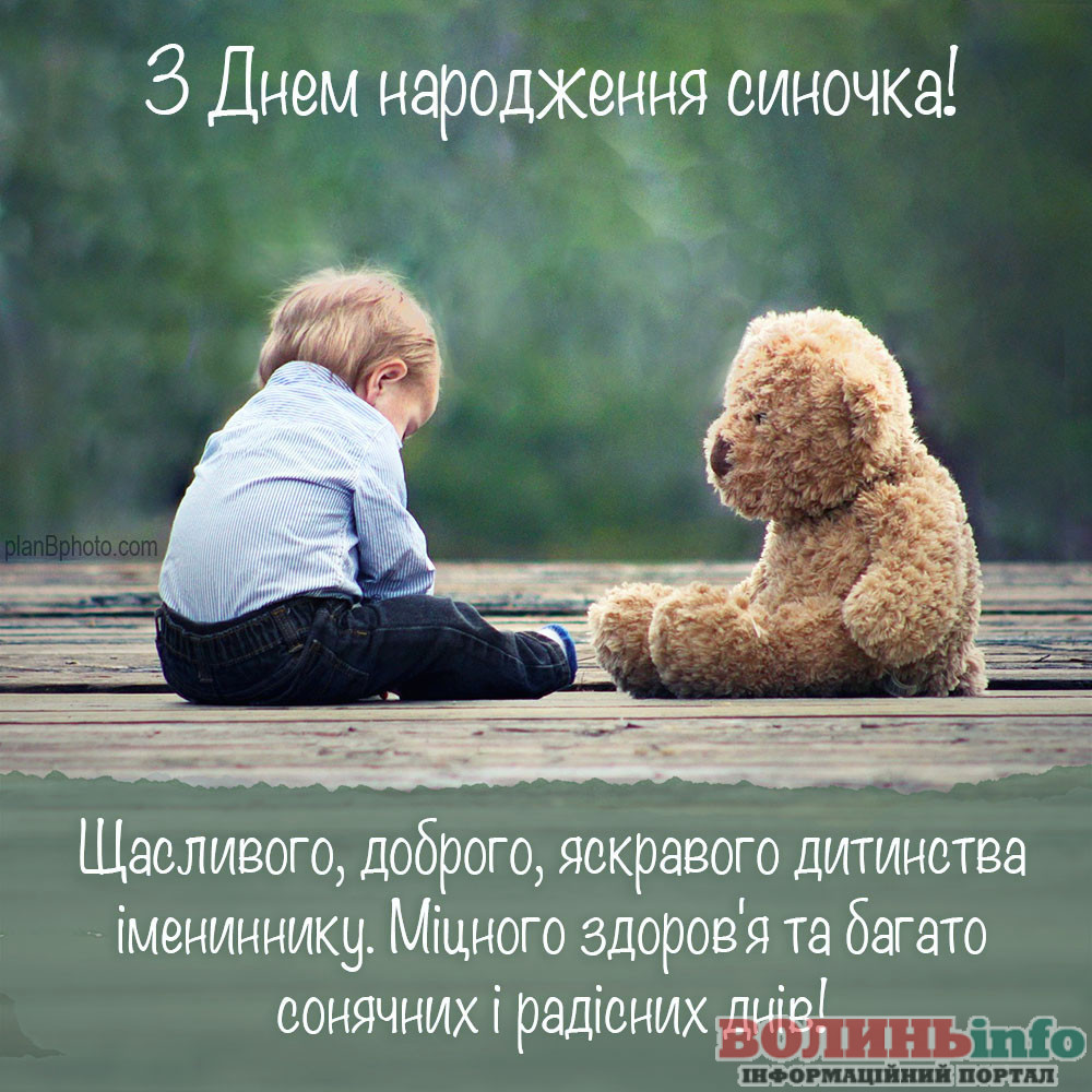 З народженням синочка! Нехай ваш хлопчик має богатирське здоров’я та веселу вдачу! Нехай росте красивим та кмітливим, добрим та чесним. Хай у нього буде багато друзів та цікавих занять. Бережіть своє сонечко, радійте йому, навчайте мудрим речам!