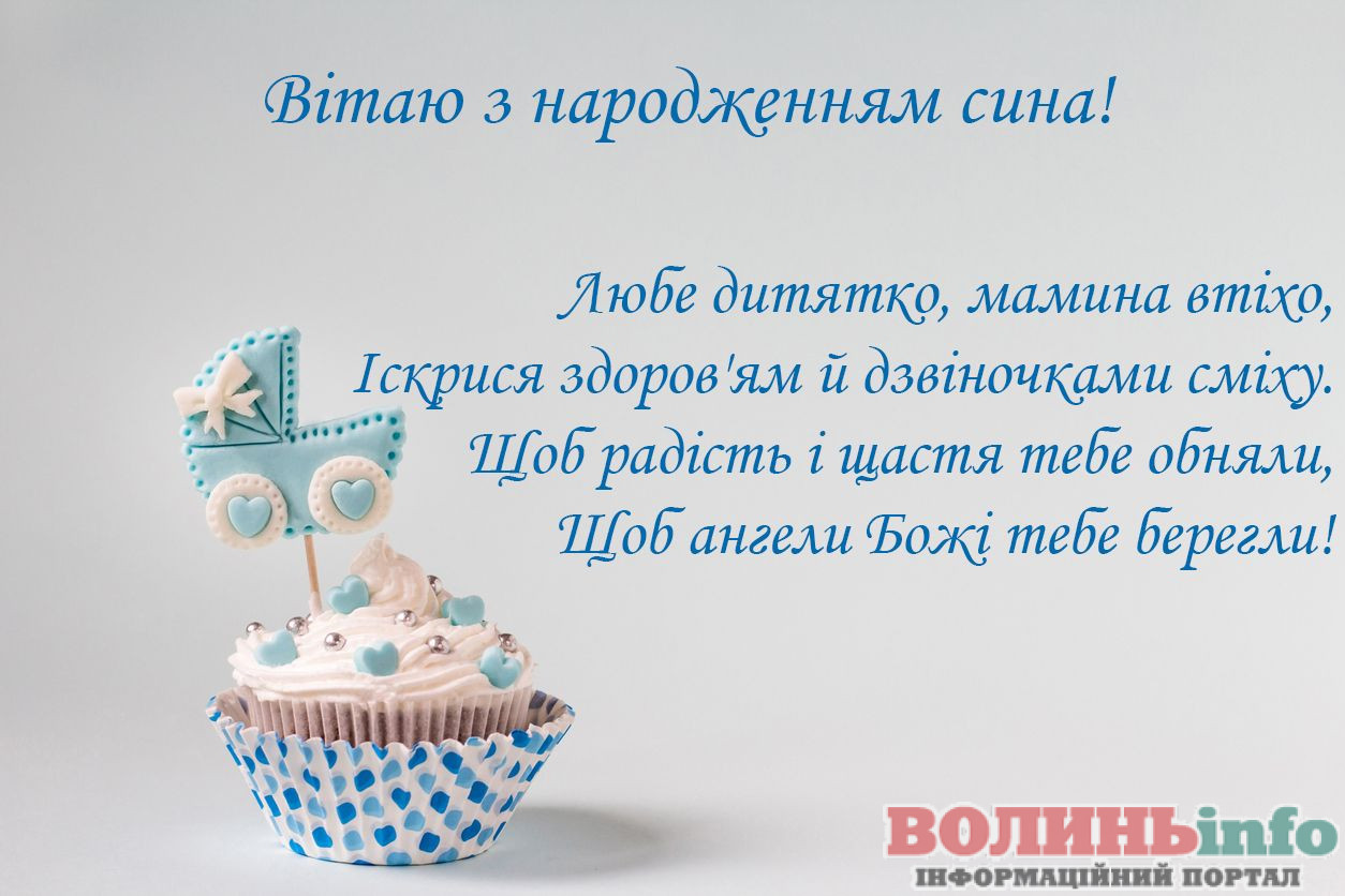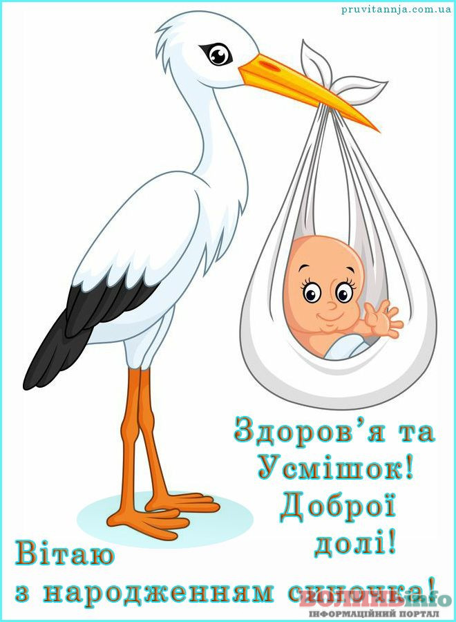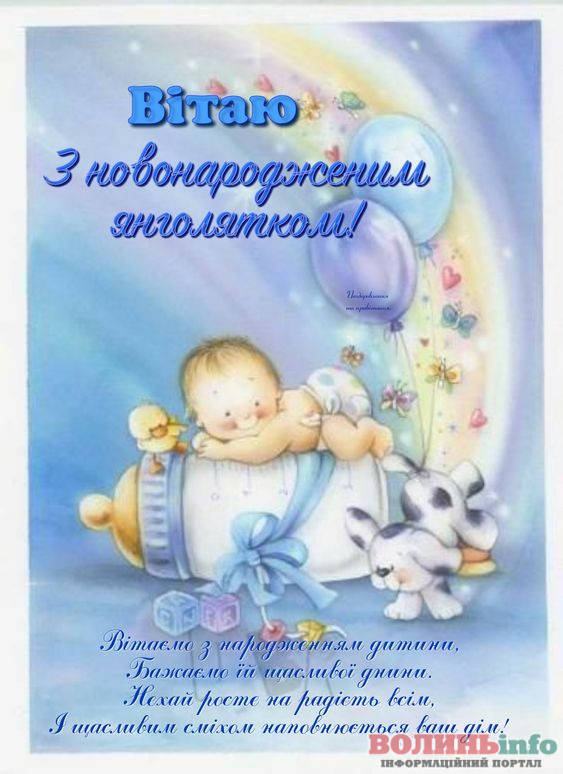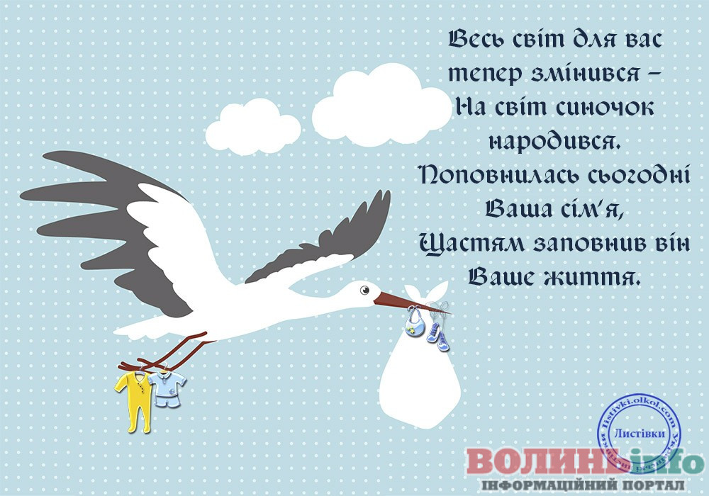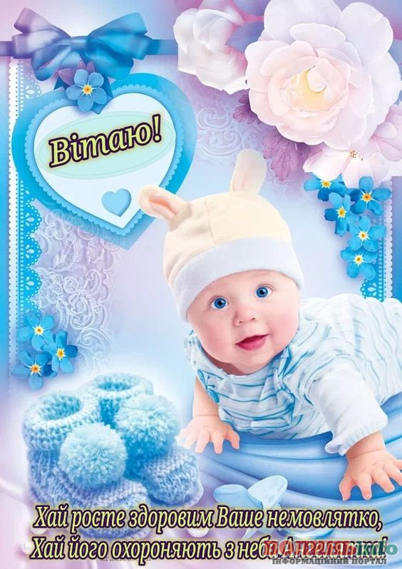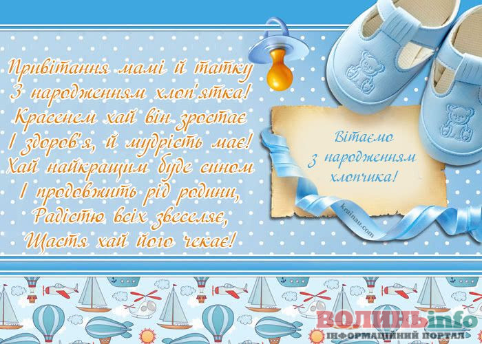 Від щирого серця вітаю з народженням прекрасного хлопчика, з появою на світ чудесного сина. Бажаю вашій родині всіх благ, миру, достатку, любові й терпіння. Нехай синочок росте міцним і здоровим, веселим і цікавим, найкращим і чудовим. Нехай його життя буде щасливим і добрим!