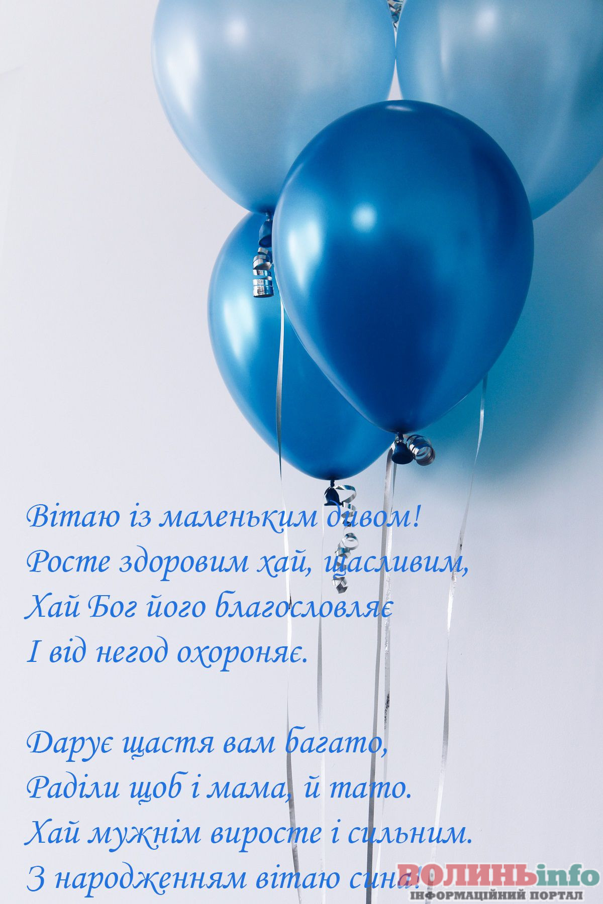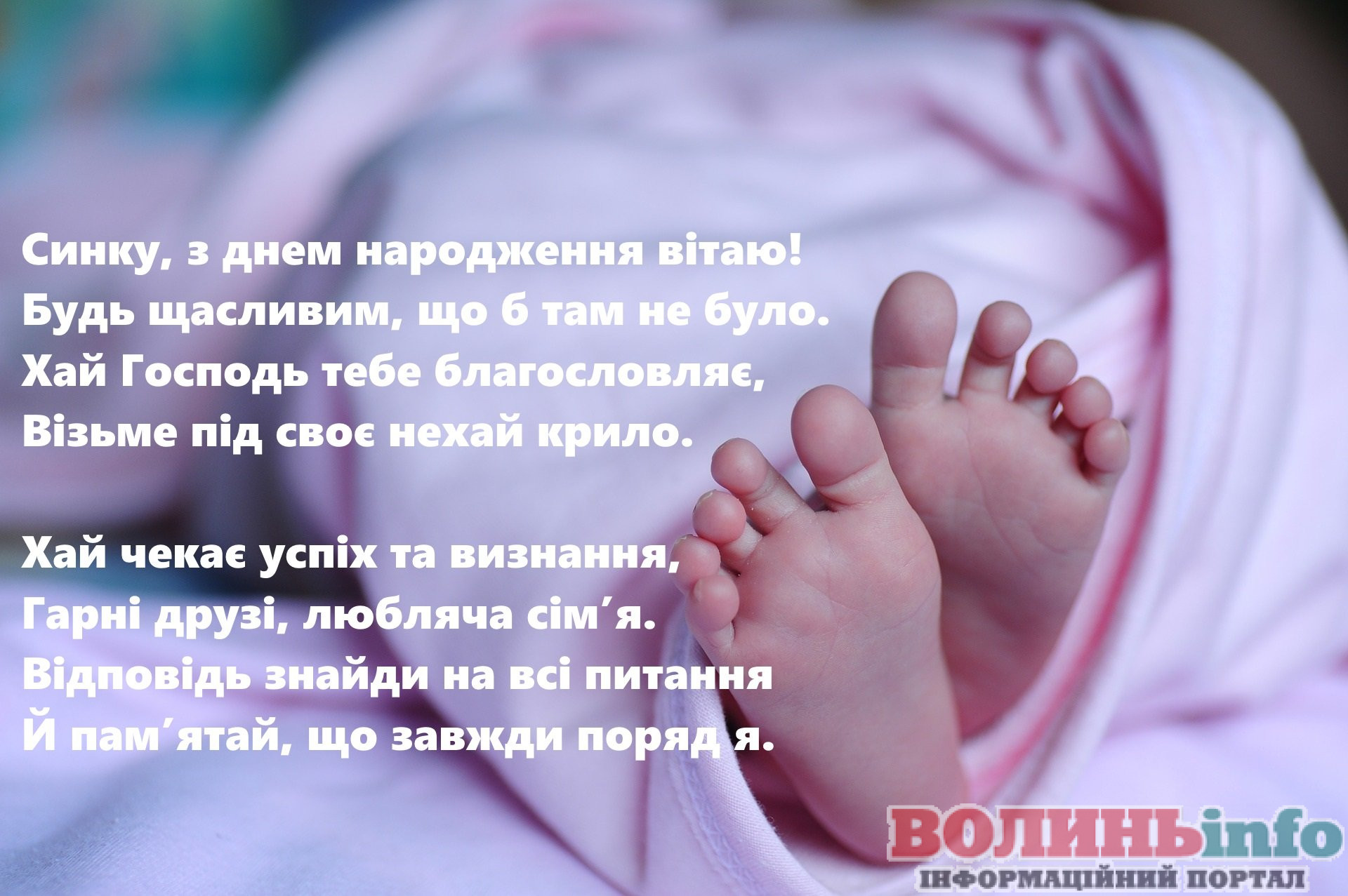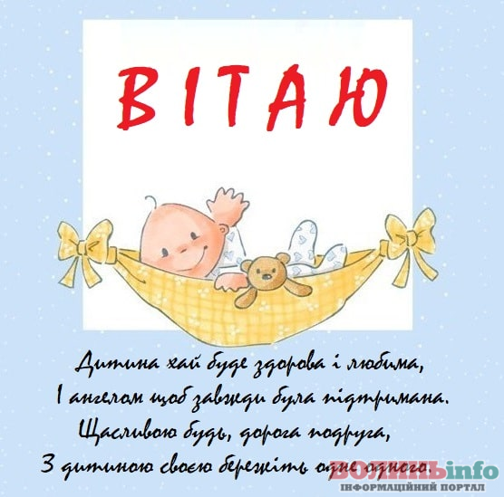Від щирого серця вітаю з народженням прекрасного хлопчика, з появою на світ чудесного сина. Бажаю вашій родині всіх благ, миру, достатку, любові й терпіння. Нехай синочок росте міцним і здоровим, веселим і цікавим, найкращим і чудовим. Нехай його життя буде щасливим і добрим!