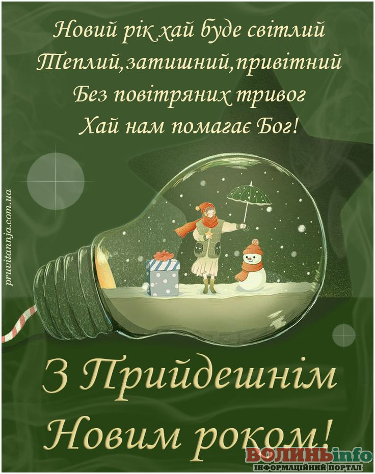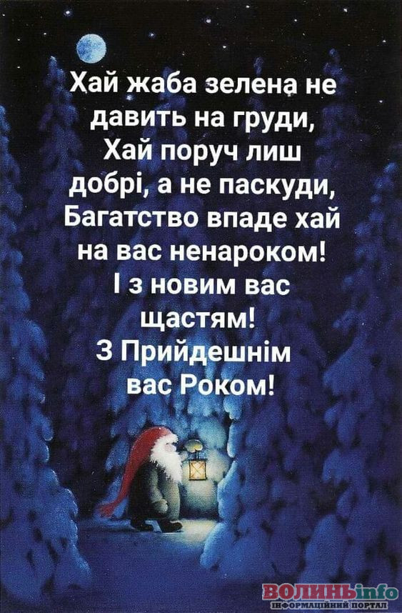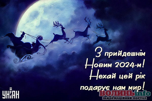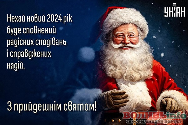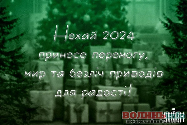 Вітаю з прийдешнім Новим роком! Бажаю світлих і ясних днів. Нехай ваша оселя буде благополучною, нехай здоров’я ваше і ваших рідних та близьких буде таким самим міцним, яким буває мороз взимку. Нехай хуртовина забере всі прикрощі, печалі й тривоги, а на зміну їм прийдуть спокій і мир. З новим щастям! З переможним 2024!