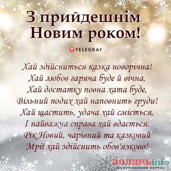 Вітаю з наближенням найрадіснішого, найдобрішого, найчарівнішого свята – Нового року! Нехай цей рік стане низкою щасливих і радісних днів, наповнених любов’ю, добром і вірою в краще!